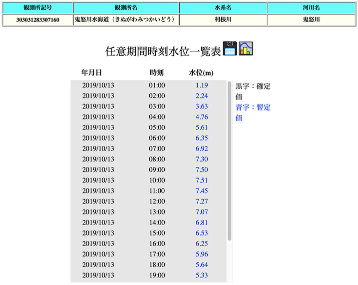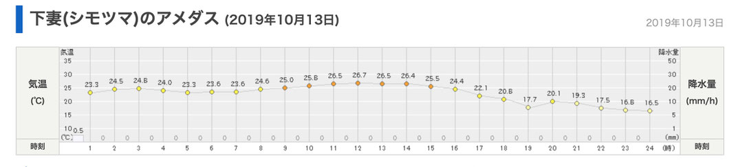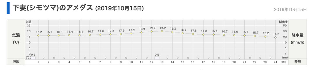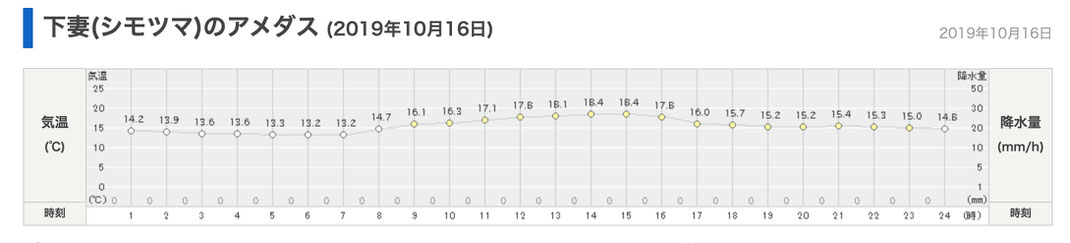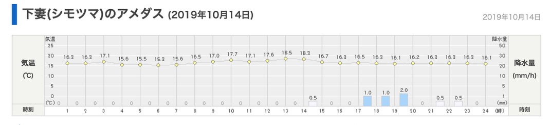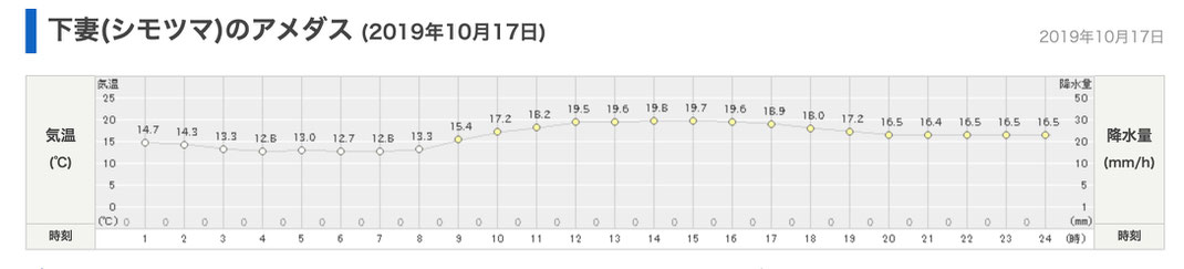 下館河川事務所は、痕跡を消すような降雨があったと言っているので、日本気象協会の tenki.jp による過去の天候データを参照する。水害の前日の10月12日から、懸案の3.00kから12.00k区間の測量のほとんどが実施された10月15日と10月17日までの、直近の観測地点の降雨量として、鬼怒川下流域の下妻(しもつま)のアメダス情報を示す。