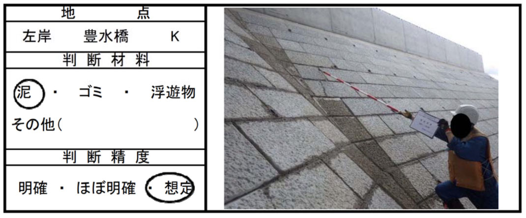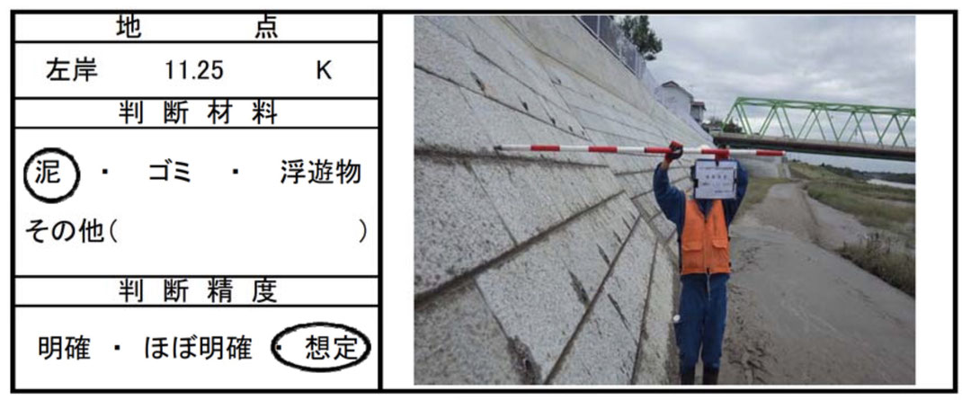 さらに、「泥・ゴミ・浮遊物」の付着状況の観察を、250mごとの距離標石地点と水門・樋管・橋梁などの施設のある地点に限定し、数mか数十m異なった位置で、容易かつ確実に観察できるものを参照させないことで、測量を極度に困難もしくは不可能にしている例もみられるのである。