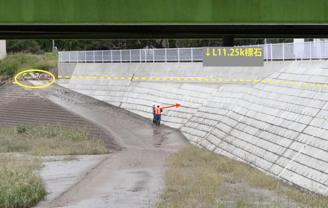 このL11.25や豊水橋の場合、間近に見えるコンクリートの絶壁の下の方の目地の泥にだけ気を取られたようで、実際にははるか上の方にある痕跡を見つけ損ない、目地の泥を指し示しす写真を残している。また、写真を見る限り白スプレーの目印も見当たらない。