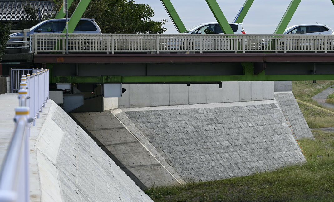次は豊水橋の地点写真である(SUVRP002.pdfのp.531)。豊水橋の真下ではなく、下流側の新造堤防のコンクリートブロックなのだが、ここでもL11.25kと全く同じミスを犯している。測量機器をもちいておこなう痕跡水位測量でもそうだが、この先遣隊による印つけは、250mごとの標石地点と樋管・橋梁を分けておこなっているようである。そうすると、この豊水橋の印つけ先遣隊は、さきほどのL11.25kとは別人かもしれず、よりによって独立してまったく同じ誤謬をおかしたことになる。