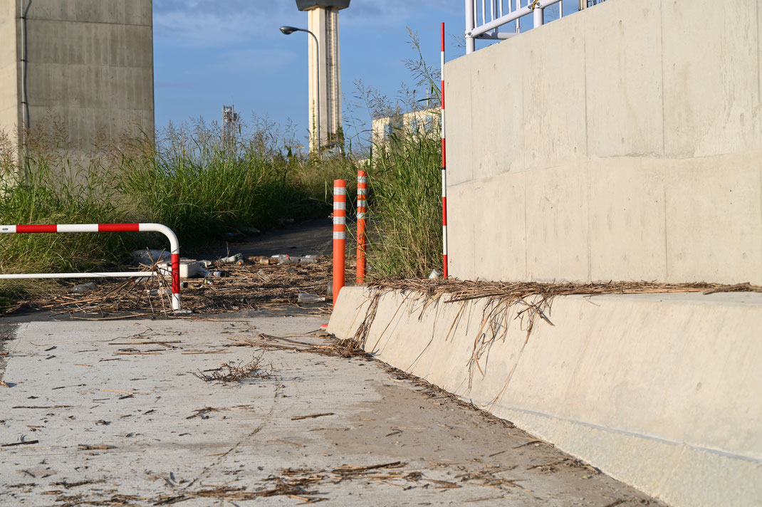 ところが、前後地点には見間違えようもない「泥・ゴミ・浮遊物」があった。すなわち、新造堤防の上流端と巨大な八間堀(はちけんぼり)水門との間の短い既設堤防(土堤)の、堤外側法面をすこし下ったところにある紅白の車止めの天端側に、「泥・ゴミ・浮遊物」が大量に残っていて、痕跡水位は容易に確認できたはずだった(2019年10月16日15:58)。