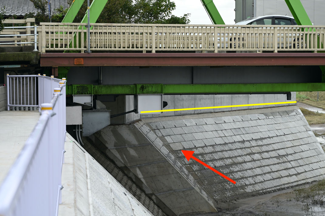 測量隊や地点写真を残した印つけ隊が誤認した高さと、実際の最高水位を示すと次のとおりである(赤矢印が誤認した高さ。黄丸が車止め地点の「泥・ゴミ・浮遊物」。黄破線が最高水位)。