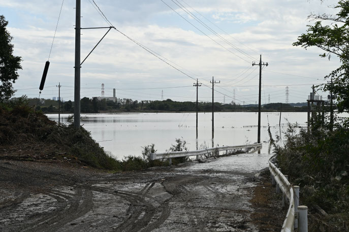 参考のために洪水時の写真を示す。2019年10月13日の12:18に対岸から撮影された写真である(知人から提供を受け、ウェブサイトへの掲載を許可いただいた)。新造堤防の上流端がさきほどの写真の紅白の車止めの地点である。鬼怒川水海道水位観測所のデータによると、9:00から11:00にかけてが水位のピークだった。写真の12:18はそこから0.3m程度低下した時点である。地点写真撮影者と痕跡水位測量者が最高水位を見誤ったことはあきらかである。