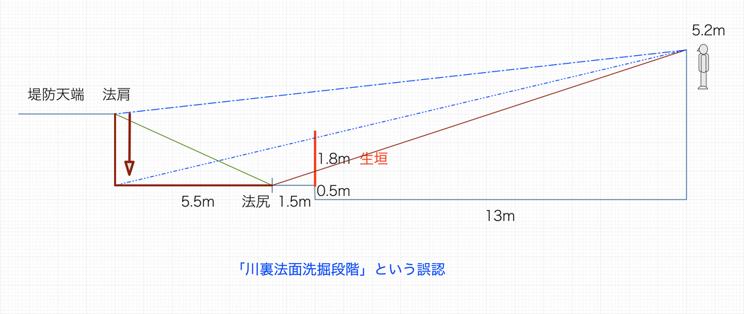 堤防の川裏側(堤内側)の法面が、越水した氾濫水により、堤体基礎地盤面まで洗掘されているのを、2階ベランダから見ている、と、この写真を見るすべての者が思いこんでしまったのです。水害直後にはじまり、完全に定着してしまった、とんでもない誤解です。 この「誤解」を断面図として表現すると下のとおりです。