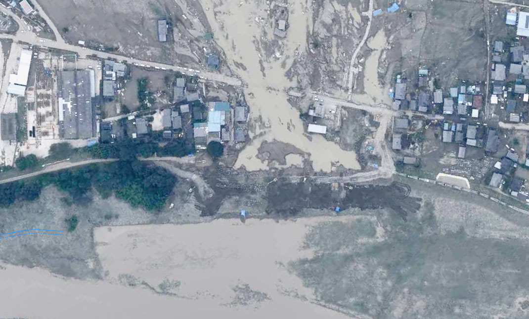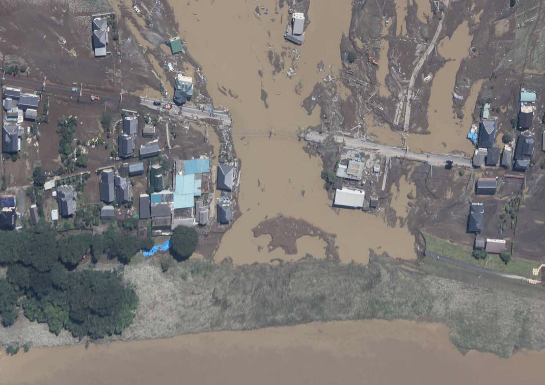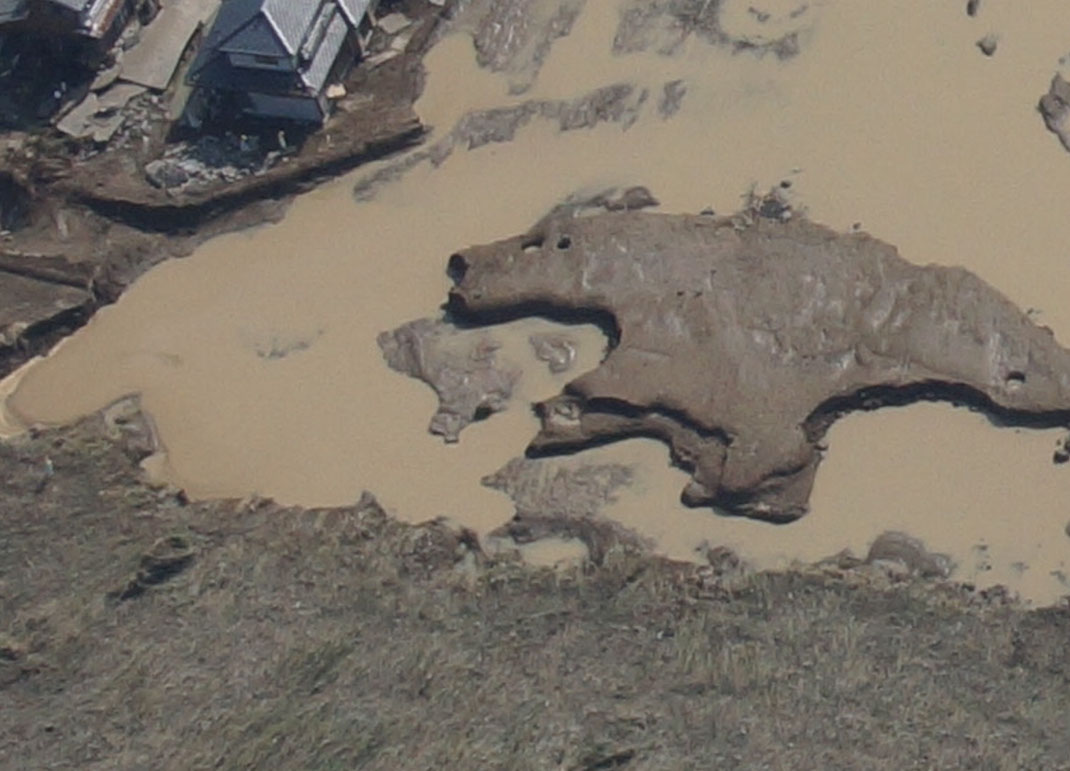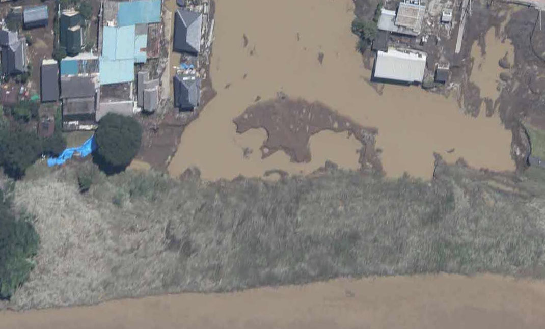 さらに寄ってみます。こんどは、水害翌日の9月11日に、国交省がヘリコプターで撮影し、水害直後に公表していた航空写真です。俯瞰撮影なのですが、画像操作により垂直撮影画像のように修整してあります。