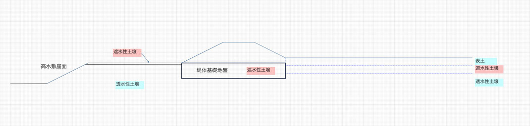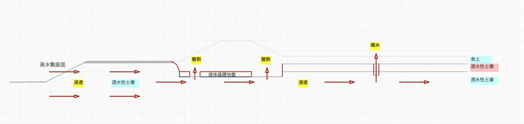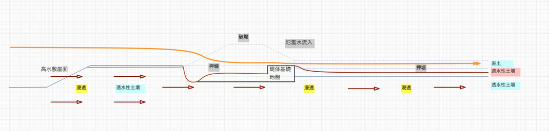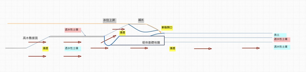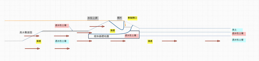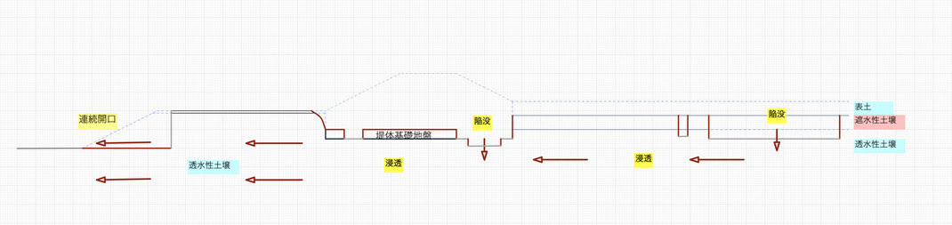 考えられる原因は、浸透による堤体内部の変性に起因する崩壊です。以下、この仮説を模式図によって段階的に示します。