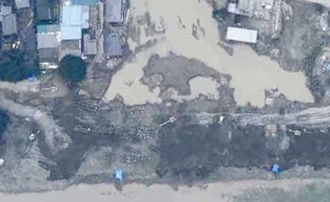少し拡大します。掘削後の高水敷の辺縁と破堤した堤防の間の、かろうじて残されていた高水敷部分が黒く見えるのは、緊急復旧工事によって運び込まれた土砂です。ブルドーザーの軌跡がよくわかります。