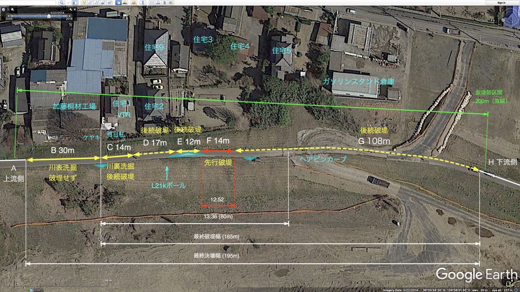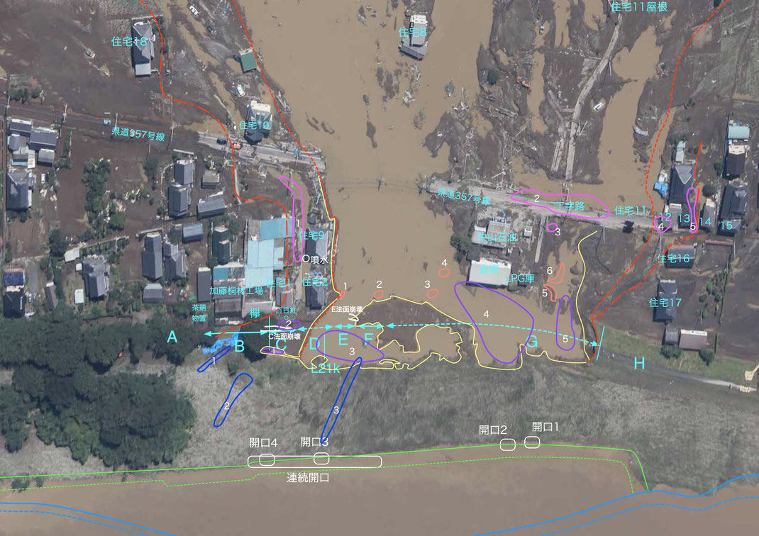 堤内地の2本の赤破線の間は、氾濫流の主流部分です。この範囲にあった家屋はすべて地盤ごと流されました。例外は地下に埋設された頑丈なタンク構造物の上に乗っているガソリンスタンド部分(中山石油)と、それが下流側の支えとなった倉庫とLPG倉庫、それと鋼管の基礎杭に乗っていた住宅8(話題になった「ヘーベルハウス」)だけです。