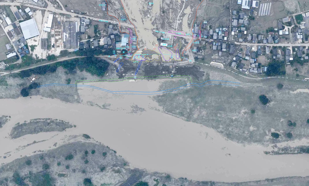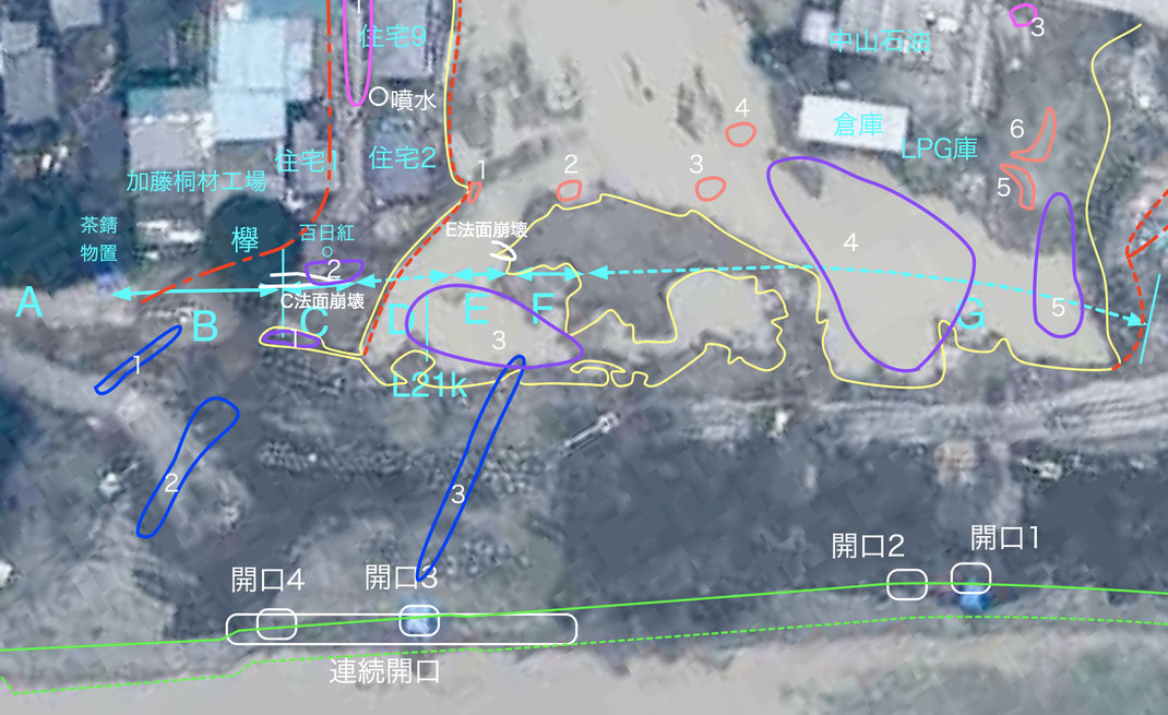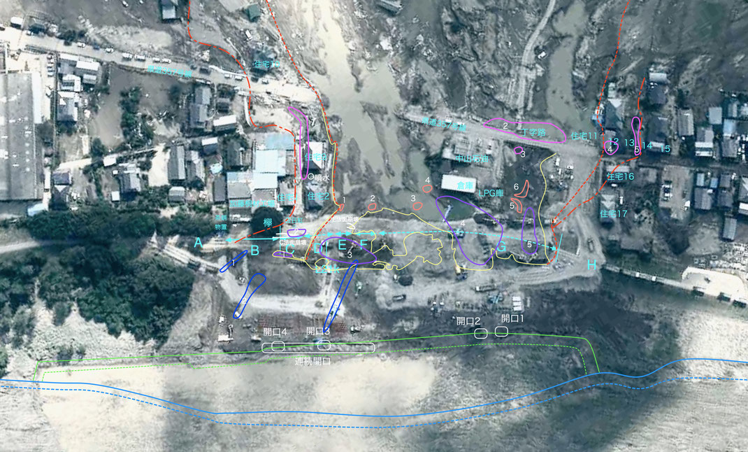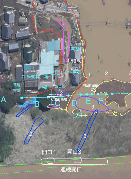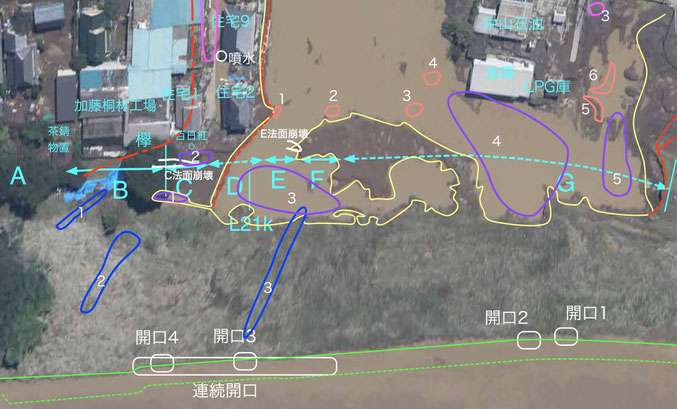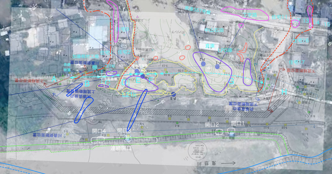 C区間における川裏側法面崩壊(一部B区間に連続)と、E区間における川裏側法面崩壊(一部F区間に連続)を白で示してあります。紫の1から4は盤割を起こしたうえさらに陥没した穴、青の1から3は地下浸透流の通り道、いわゆる「水みち」です。黄線は、水害後に残った堤体基礎地盤の辺縁です。