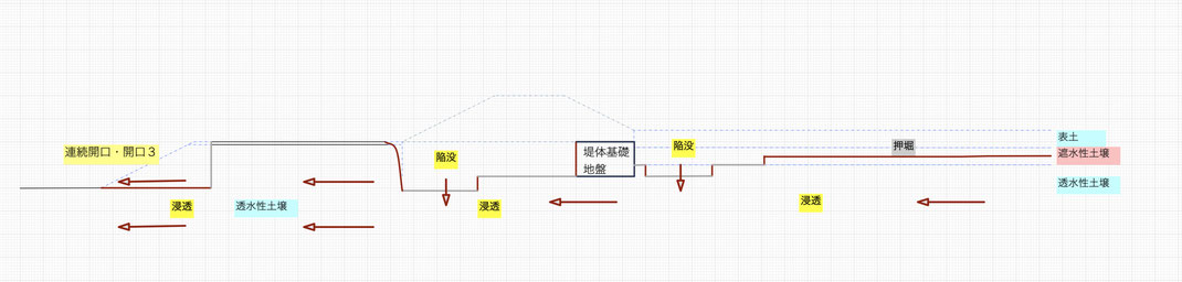 紫の3・4の、盤割を起こしたうえさらに陥没した穴と、青の1から3地下浸透流の通り道、いわゆる「水みち」は、9月13日以前は地下に隠れていてまったく見えず、それ以降は、堤体直下やそれに沿った堤外地に大量の土砂が搬入され積み上げられて隠れてしまったことで、状況がまったくわからないのです。