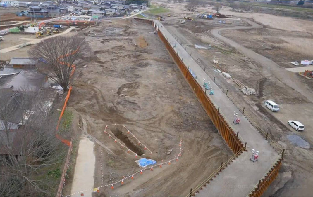 下の写真は、現場説明会パンフに掲載されているもので、仮堤防のうち、堤内側の土堤(「荒締め切り」)とその基礎地盤を撤去した際の写真です(2016年2月25日)。