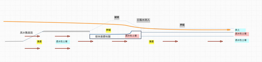 2015年9月10日、水位が上昇し、おそくとも11:00ころまでには、越水が始まっていましたが、高水敷から、とくに2013−14年の掘削によってできた段差4mの崖面から、堤体基礎地盤の下を潜(くぐ)って堤内地へと浸透し、地下水の圧力を高めます。同時に、堤体基礎地盤の上側へも浸透し、堤体の川表(かわおもて)側法面からの浸透水を一体になり川裏側法面を断裂させます。