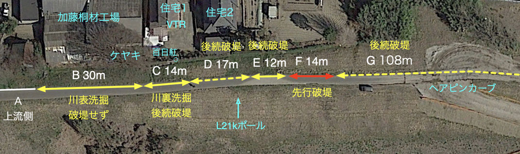 これが破堤した範囲だとされる区間はそのまま信用して作図すると、「約20m」は少々鯖読みで、実際は約14mです。(以上については、〈まさかの三坂〉の5〈対岸から撮影された破堤直後の画像〉参照)