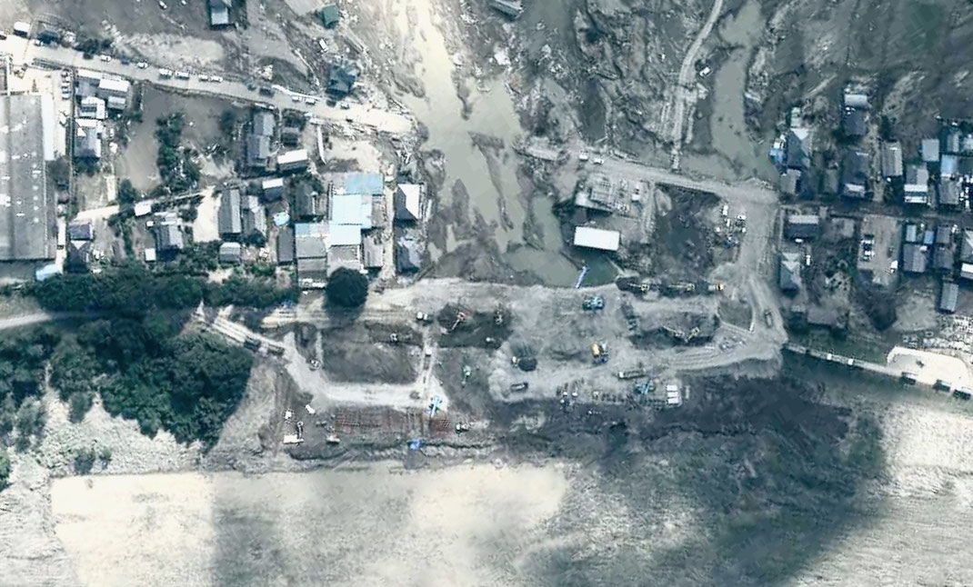 右下は9月13日に防災科研が撮影したもので、上の写真の左隅の緑のバックホウのあたりから撮ったものです。(左が住宅2、奥が下流側破堤断面、その左が中山石油の倉庫、それらの手前が黄四角の基礎地盤)