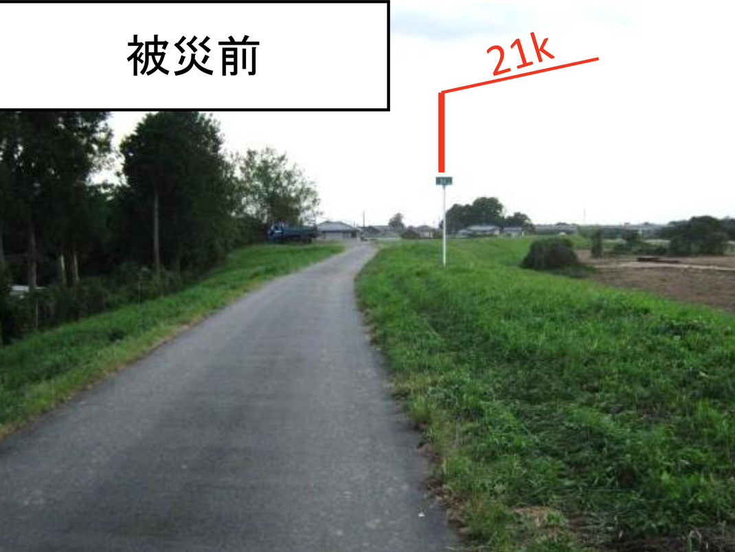 なお、右の水害前の写真のとおり(「鬼怒川堤防調査委員会」資料)、上流側のD区間(下流端近くに21k距離標石とポール)は川表側に堤防補強のために腹付してあって、幅3m近く、高さ30cmほどの草地の天端があり、越水は起きていません。
