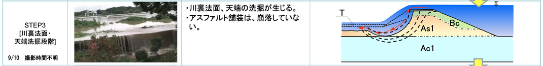 「撮影時間不明」とあるとおり、委員の先生方や局の広報担当者らは時刻の特定すらできていないのですが、より重大な問題は、前述のとおりこの地点の破堤はこの「越水」が原因ではなく、F区間の破堤による破堤断面の洗掘が上流側に進行する、側方侵食(という用語があるわけではありませんが)によって起きるのであって、あたかも越水が原因で起きる破堤の「STEP3」であるかのようにいうのは不適切なのです。