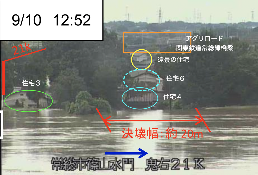 ともかく、12:52:53の静止画像は次のとおりです。左岸21km地点の距離標石とポールを示す「21k」と、「決壊幅約20m」の赤字ふたつは、関東地方整備局による書き込みです。それ以外は引用者の描き込みです。なお、「決壊」とは堤体の一部損傷であり(B区間がこれにあたります。したがって、三坂の「決壊」区間は195m、そのうち「破堤」したのはB区間の30mを除く165mです)、「破堤」が基礎地盤まですべて流失した段階のことです(〈まさかの三坂〉の1〈決壊と破堤〉参照)。関東地方整備局の用語法はおおむね曖昧、ときにデタラメであり、常々困惑させられるのですが、一応ここでは「決壊」ではなく、「破堤」のことと受け取っておきます。