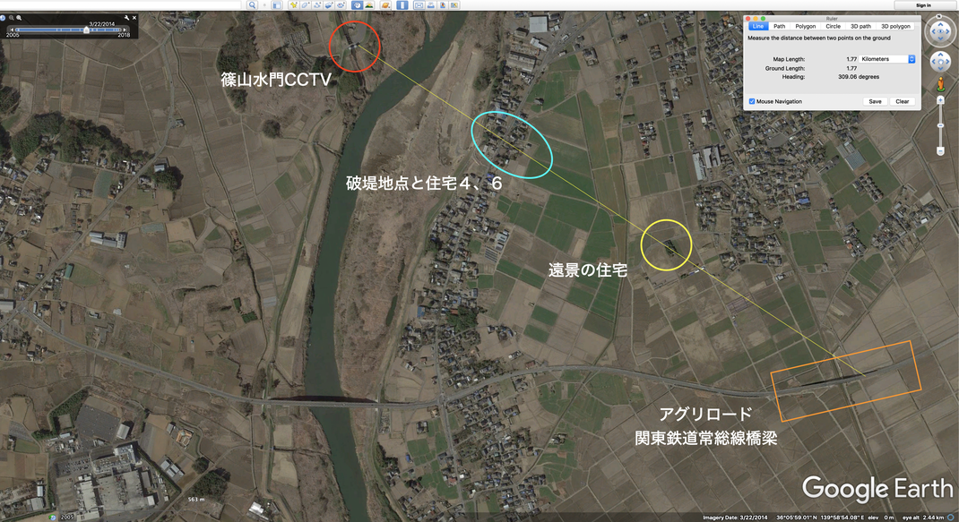 篠山水門、画面に映り込んでいる住宅4・6、遠景の住宅、アグリロードが関東鉄道常総線をまたぐ高架橋の位置関係は次のとおりです。