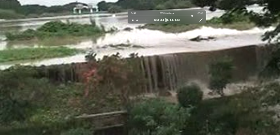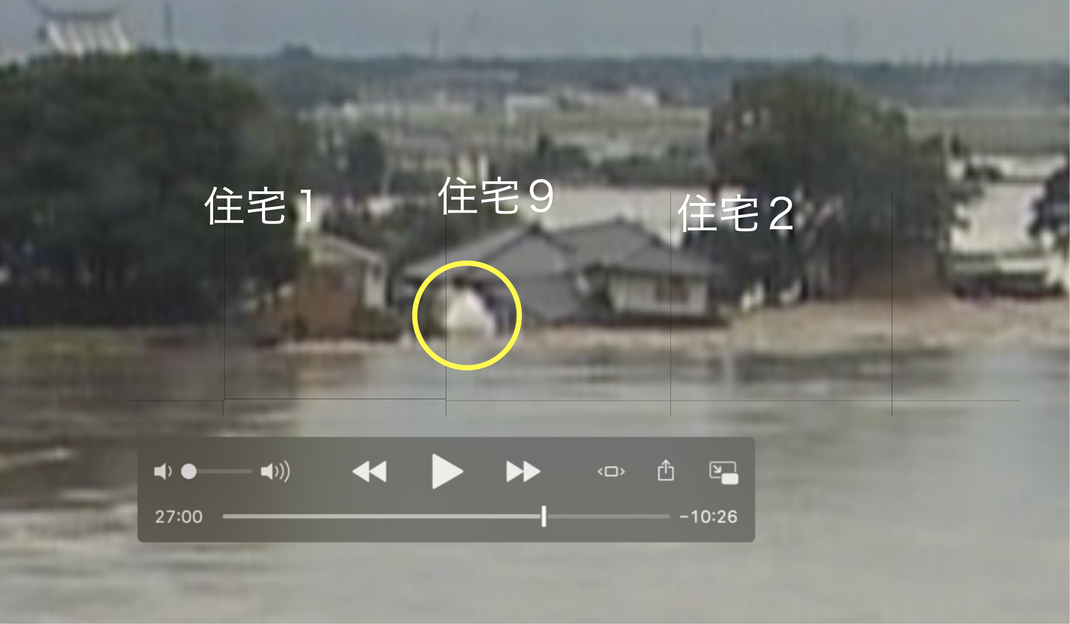 次の画像は、C区間のすぐ近くの住宅1の住人の方が、F区間の破堤から数分後の13:00直前に、2階ベランダから撮影したVTR画像の1コマです(https://www.ktr.mlit.go.jp/river/bousai/river_bousai00000101.html)。画面下が堤防の川裏側法面基部の生垣で、左に木戸とそこに枝垂れかかる百日紅の紅い花が写っています。対岸の将門(しょうもん)川が鬼怒川に合流する地点の篠山(しのやま)水門も見えています(その上流側螺旋階段中心軸上のCCTVカメラによる13:23以降の画像が残されています)。