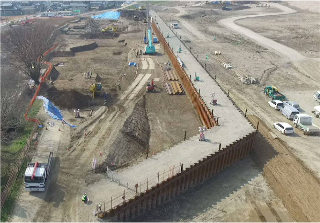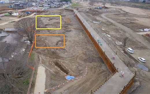 次は、同じパンフレットの「置換盛土基盤の掘削整形状況(3月4日)」という写真です。俯角が多少違いますが、さきほどの写真と同様にUAVで撮影した動画からの切り出しでしょう。