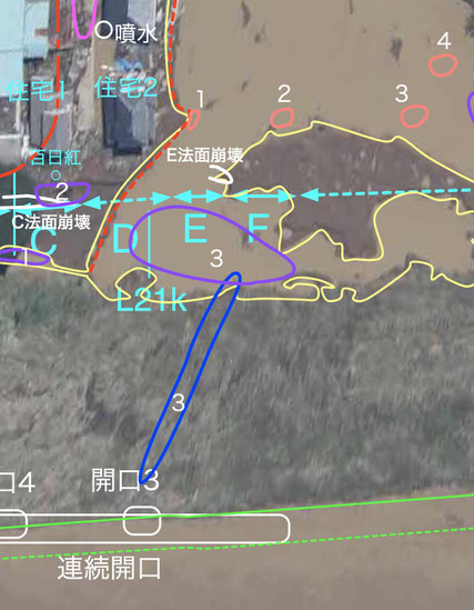 堤外側には、2013−14年に国交省が実施した高水敷掘削によって形成された落差約4mの崖面(緑線)において、水位低下時に河道方向に砂と水が噴出して形成された開口を、白で示してあります(開口3・4と連続開口は仮堤防建造工事に際して埋め戻されていますが、開口1・2はその後もしばらく残ります)。