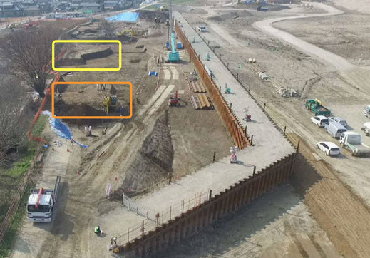 鋼矢板を2列に打ち込んで砕石を充填した二重締まりの、河道側と堤内地側を貫通して色味のことなる土砂が見えます。それが青の2と青の3です。二重締まりを壊すことになるので、この時点で青の1同様に掘削と埋め戻しをおこなうわけにはいきません。