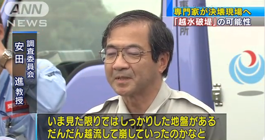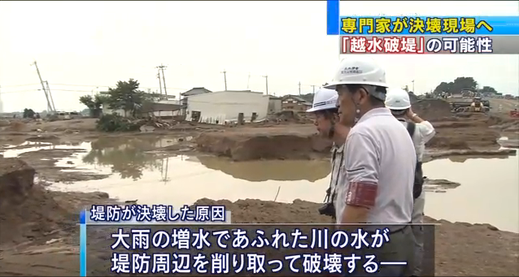 この13日の昼まえに、「鬼怒川堤防調査委員会」や「土木学会」のお歴々がこの地盤の上に立って、周りを見回し、「しっかりした地盤がある」という意味不明のコメントを発したうえ、早くも破堤原因は越水であると断言しています。