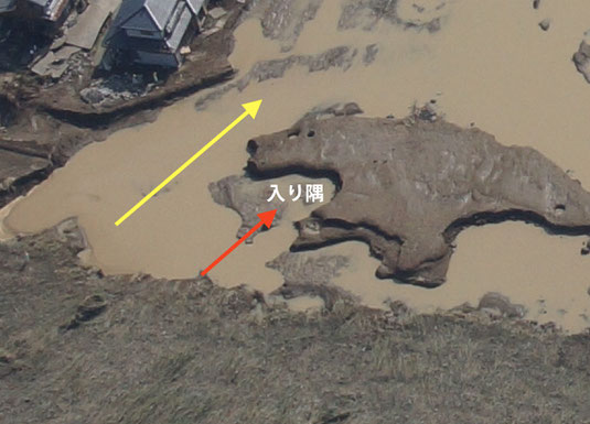 しかし、地上氾濫流という単一の原因によって、このような複雑な形態を生ずるのはなぜなのか、まったく説明がつかないのです。この堤体直下の線は、地上氾濫流がもっとも激しく、しかも最大の水深で、流入していたのですが、そこにこのF区間のような“入り隅”ができるのは、いささか不可思議です。残存した地盤の辺縁が、このように鋭角になっているのも、不自然です。D区間やE区間は(最初、どのように堤体や基礎地盤の崩壊が始まったにせよ)、地上氾濫流が堤内地へと一気に走り抜けていていて(黄矢印)、このF区間のように基礎地盤がその流れに立ち塞がり、氾濫流の只中に残ったりはしていません。