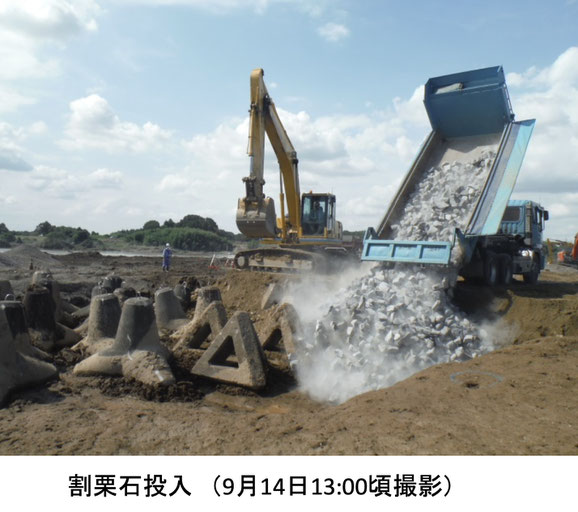 仮堤防の建造は9月10日のうちにすでに始まっていたのですが、堤体近くの高水敷から堤体基礎地盤にかけて、地下浸透流の通路、いわゆる「水みち」が3箇所あったようです。その抉れは周囲よりも一層深くまで達していて、しかも細長く続いていたのですが、そこにも砕石が投入されていて、その上に仮堤防が積み上げられていたのです(右の写真は、