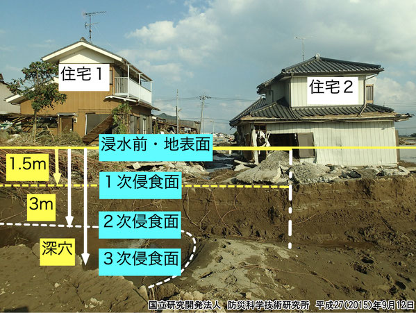 地上氾濫流によって表土=住宅の基礎地盤が流失し、住宅2が達磨落としのように陥落した1次侵食面