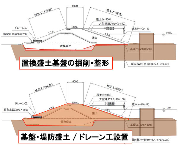 まず、本復旧堤防の構造図です。従来は基礎地盤も全部置換した、すなわちもとの基礎地盤を全部撤去し、あらたに基礎地盤を造成したかのように説明されていたのですが、どうやらそうではなかったようです。もとの基礎地盤のうち、水害後に残った部分はそのまま残したようです。