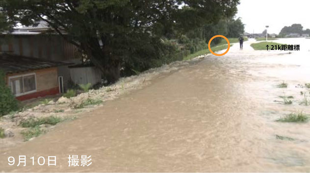 〈越水の進行〉の9月10日12:05ころの「写真12」のとおり、人物が立っているのがD区間、その向こうが越水しているE区間です。橙円の箇所に開口があるはずですが、見えていません。