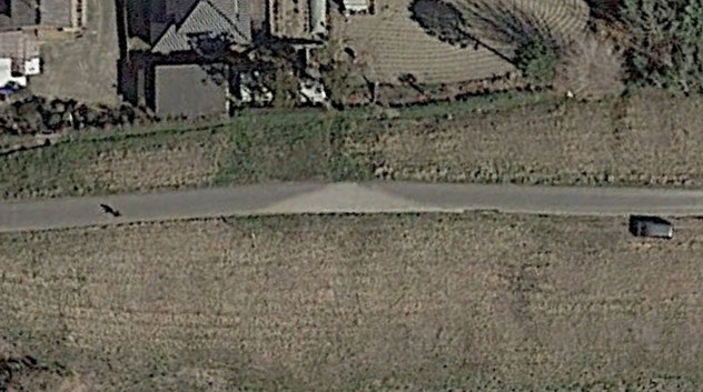 住宅9の北側、すなわち住宅2に続く砕石敷の私道と住宅1に続くコンクリート舗装の私道部分で、かなり大規模な陥没が起きています(サーモン1)。住宅9の傾斜具合、住宅1の私道のコンクリート舗装の破壊の具合は、住宅13の傾斜と県道357号線の舗装の破壊具合と、極めてよく似ています。(この2か所の陥没については、前ページ参照)
