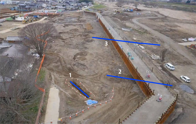 そんなものの上に本復旧堤防を乗せるわけにはいきませんから、堤体直下の基礎地盤にあたる地点ではその砕石を取り除き、穴を粘性土で埋め戻したようです。それが、さきほどの平面図の青の1です。