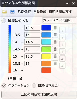 次は、国土地理院の「地理院地図」(http://maps.gsi.go.jp/)の「自分で作る色別標高図」で破堤点を中心に、押堀とそこから抉り取られて堆積した砂層の標高を示したものです。標高データは水害直後の航空レーザー測量によるものです(Y.P.ではなくT.P. 地図上でカーソルを置いた地点の標高が0.1m刻みで表示されますが、色別表示は0.5m刻みで設定できます)。