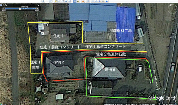 3つめの地表面の陥没事例として、住宅9および住宅1・2の私道の例を見ます。これは、4浸透による堤内地盤崩壊で検討したもので、当初は盤割だと考えたのですが、住宅12と県道357号線について詳細に検討したあとで再考すると、これもまた陥没と考えるのが妥当のようです(4浸透による堤内地盤崩壊の(iv)も書き換えました。)。