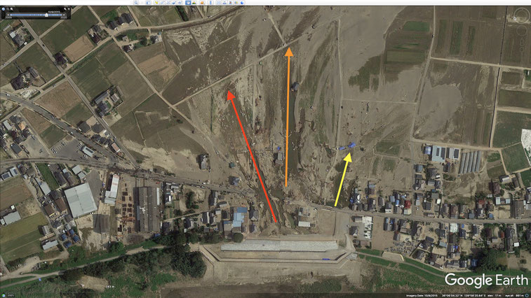 破堤地点直下から、やや上流方向に回り込むようにできた深くて長大な押堀(上の赤矢印と橙矢印)ができています。