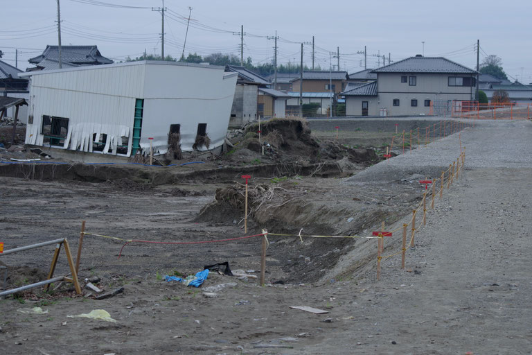 右上の写真は、2015年12月に現地で撮影したものです。盤割・陥没が起きていた押堀にはすでにだいぶ土砂が投入されています。関東地方整備局がやるとも思われないので、おそらく県道357号線復旧工事のついでに茨城県常総工事事務所が実施しているのでしょう。丁張りの横赤木までさらに土を入れるようですが、それが元の地表面の高さでしょう。ガソリンスタンド倉庫の手前の丁張りをみると、この倉庫がどのくらいダルマ落としのように落ち噛んだかがわかります。その右は、常田教授が堤防拡幅部と勘違いした土饅頭で、赤横木の上だけが地上に盛り上がっていた部分ですその左がプロパンガスボンベ倉庫です。元の地表面の高さで建っています。