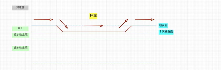 氾濫流が直撃した地点のうち、堤体基礎地盤から堤内地にかけての、連続的に遮水性の土壌が施工されていた範囲で、まず氾濫流によって押堀が形成された。